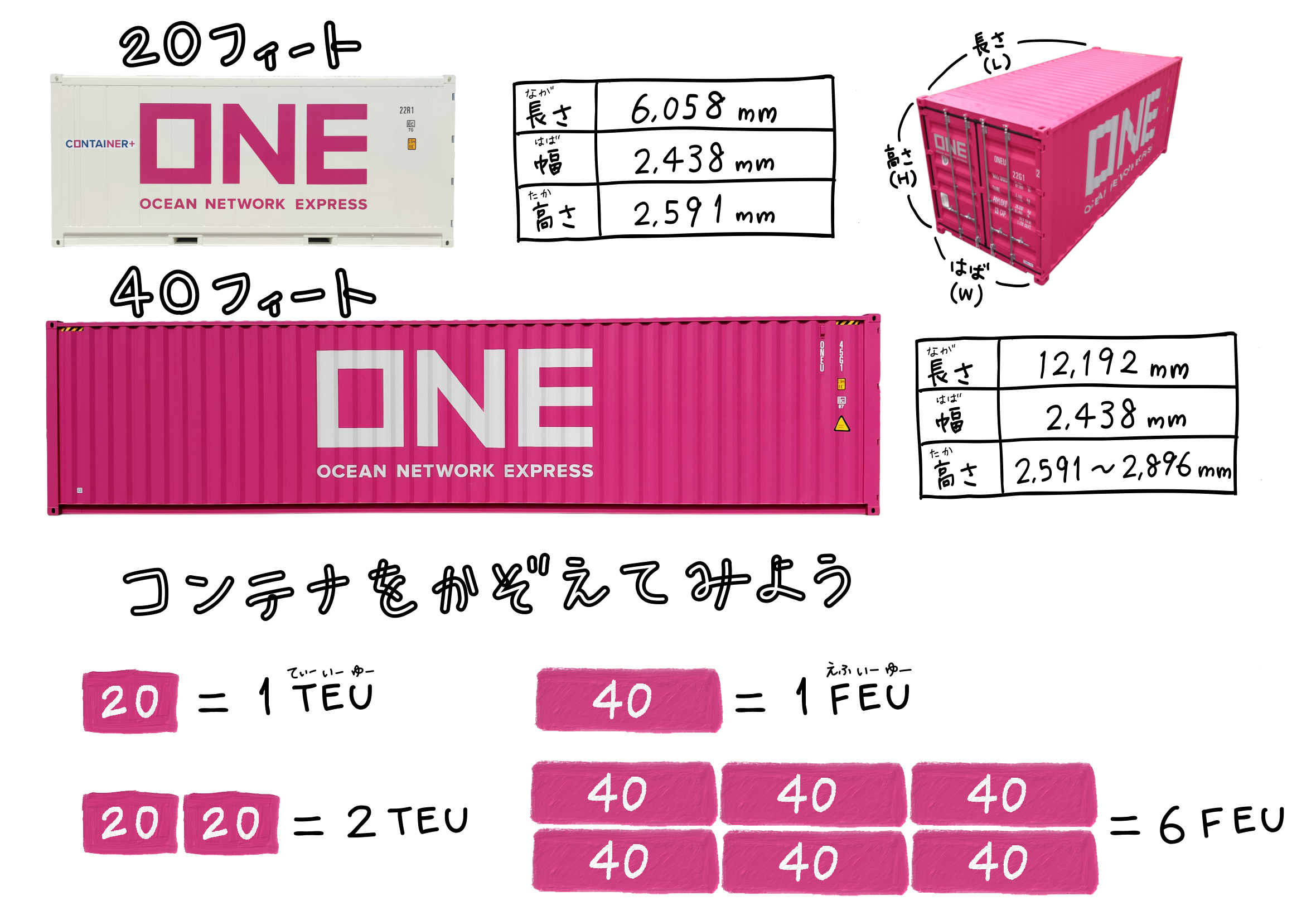 コンテナの代表的なサイズは20フィート(TEU)と40フィート(FEU)*の2種類です。